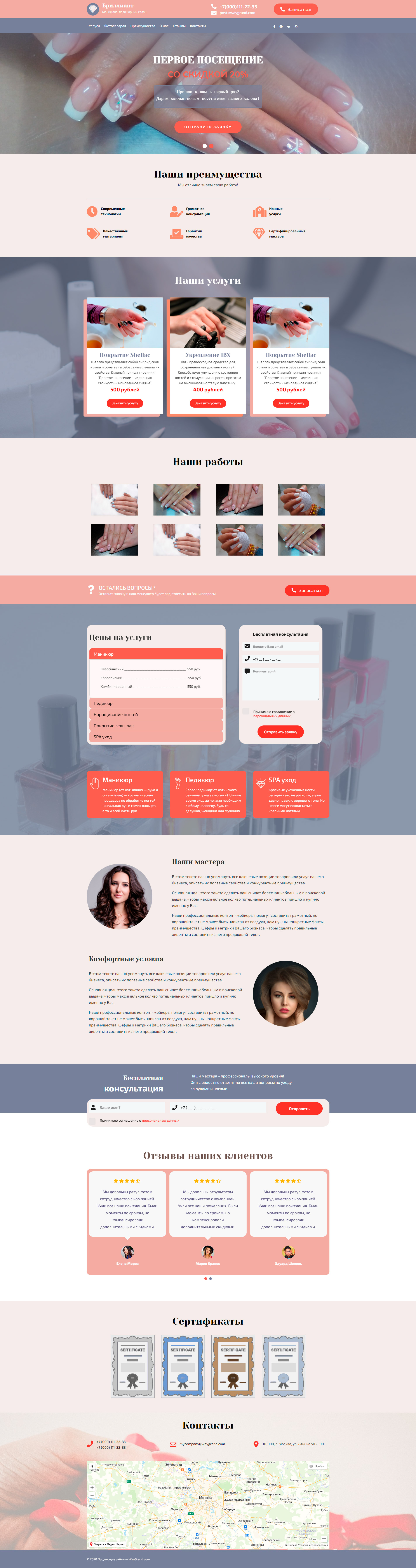 Закажите готовый продающий сайт лендинг #1107201 в Арзамасе за 1-3 дня «под ключ»: свёрстан, отрисован и готов к рекламе. Тематика шаблона «Салон маникюра и педикюра».